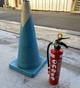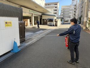 先日、消火器の使い方の練習と防災訓練を行いました。